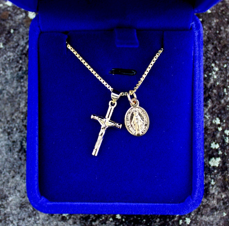 This offering is a dainty gold tone miraculous medal necklace. The chain is a gold-plated sterling silver box chain. The medal and crucifix charm is gold- tone and made in Italy.
